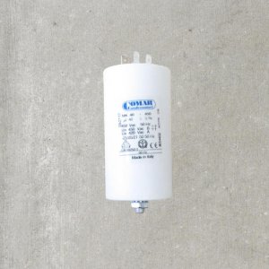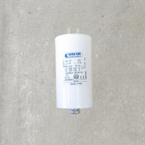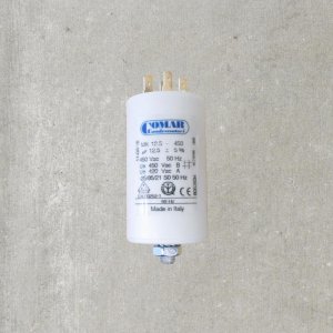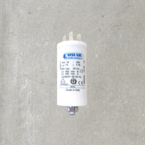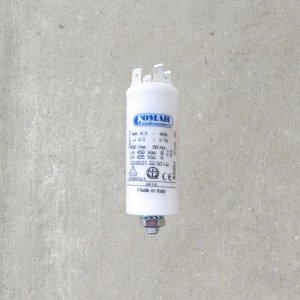 Comar Condensatori MK 450V Series Motor Run Capacitors. CR115 15?f Capacitance, 40mm ? x 70mm, 450V AC. Motor run capacitors are used to improve the value of the cos ? when the motor is working at rated load conditions. They are permanently connected to the motor. 6.3mm Fast on Double Tags and M8 x 10mm Stud. Supplied complete with externally toothed anti shake washer and M8 nut. Specifications: Capacitance tolerance: ?5%. Rated Frequency: 50/60Hz. Dissipation Factor: < 5 x 10?. Insulation Resistance: < 1 x 10? M? x ?F. Test Voltage between Terminals: 2,15 Vn, 2 sec CEI 33-3, CEI EN 60252, VDE 560-8. Test Voltage between Terminals and Case: 2 KVac 2 sec EN 60252 (IEC 252). Optional accessories: CS902 pre terminated 300mm Bi-Polar lead, CR501 50mm protective cap